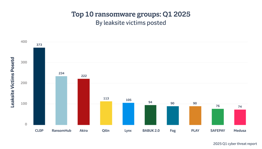 - Ransomware spiked (again) in Q1: Over 2,200 victims were listed on leak sites in Q1, a 35% jump from the previous quarter.
