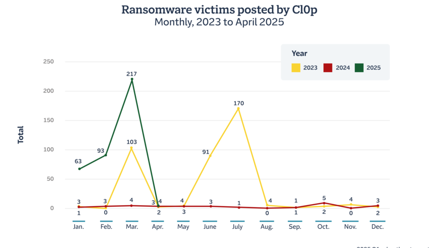 The first driver of note for Q1 2025 was the mass-exploit of a vulnerability by the Cl0p ransomware gang. The initial attacks exploiting the vulnerability took place in December 2024 and led to at least 373 victims being posted on leak sites in the following months, including over 200 in March alone, making it the most active month in our records dating back to 2021.