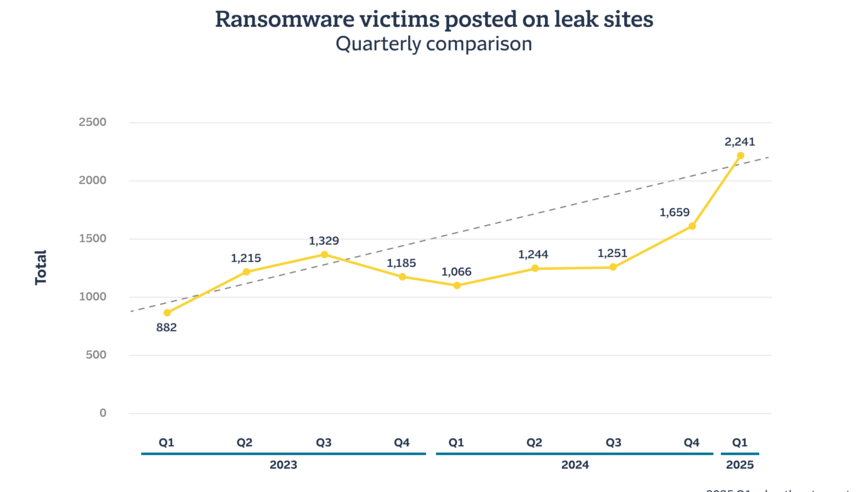 The first quarter of 2025 has seen ransomware attacks continue growing in frequency, with the number of victims seen posted on leak sites* rising to 2,241 between January 1st and March 30th of 2025. This marks a 35% increase in activity since last quarter and is more than double the level seen in the first quarter last year.